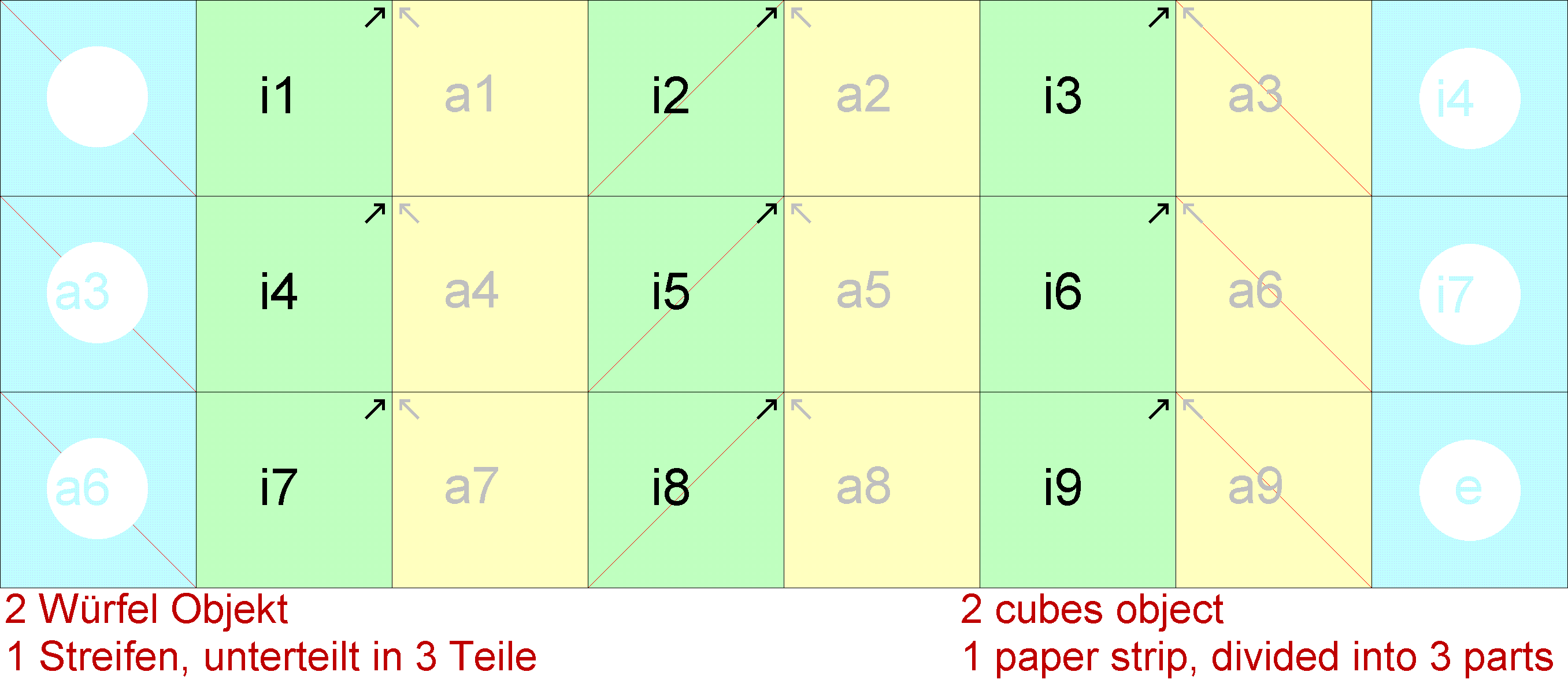 2-Würfel- Objekt 11 Ecken 21 Kanten 12 Flächen 6 Quadrate (6 Q.) 6 rechtwinklig- gleichschenklige Dreiecke (6 Dr.) |